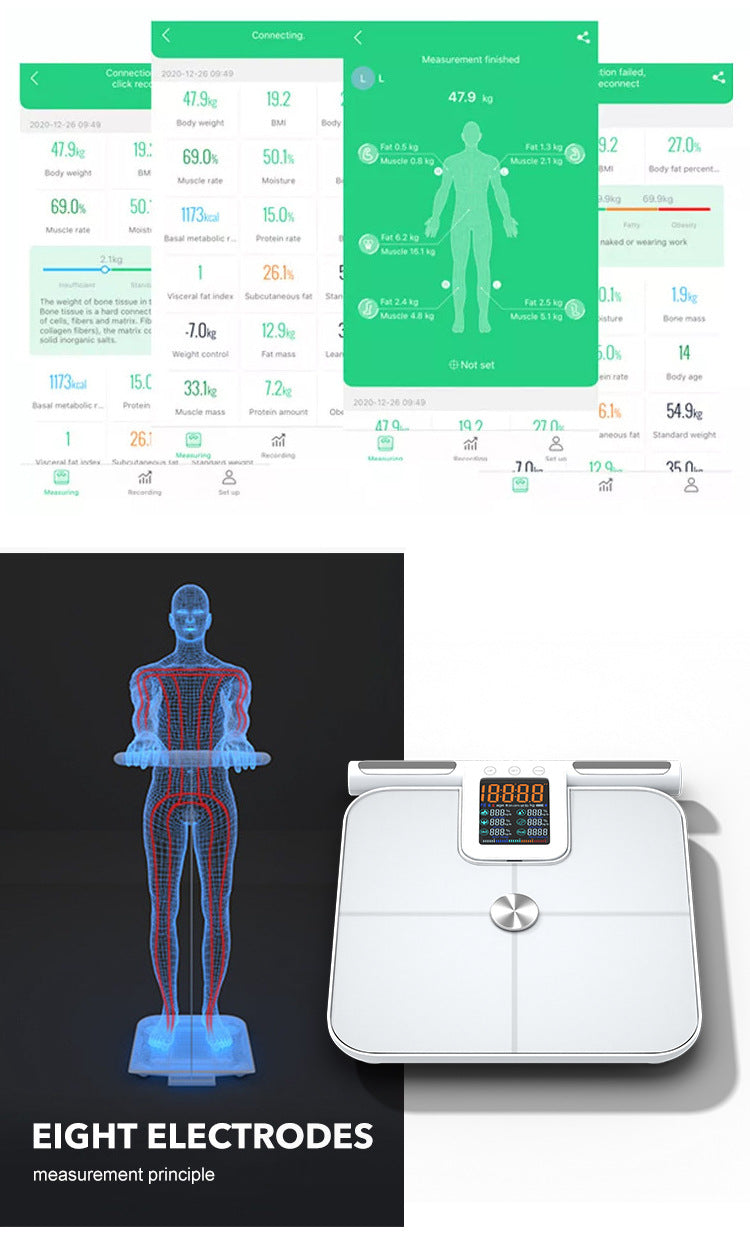Normale Waagen messen nur das Gewicht. Diese 8-Elektroden-Waage nutzt Bioimpedanzanalyse, um sichere elektrische Signale durch den Körper zu senden, die Muskel-, Fett-, Wasser- und Knochenwerte segmental erfassen – für umfassende Gesundheitsdaten.