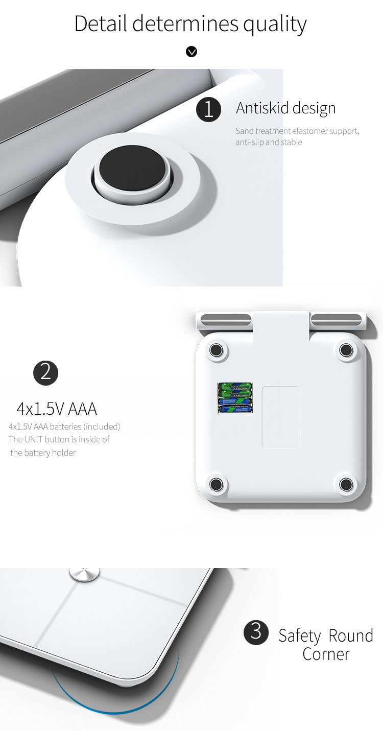 7 wichtige Gesundheitsmetriken – Misst Körpergewicht, Körperfettanteil, Skelettmuskelmasse, viszerales Fett, Knochenmasse, Grundumsatz (BMR) und Körperalter – und liefert so in wenigen Sekunden ein umfassendes Gesundheitsprofil.